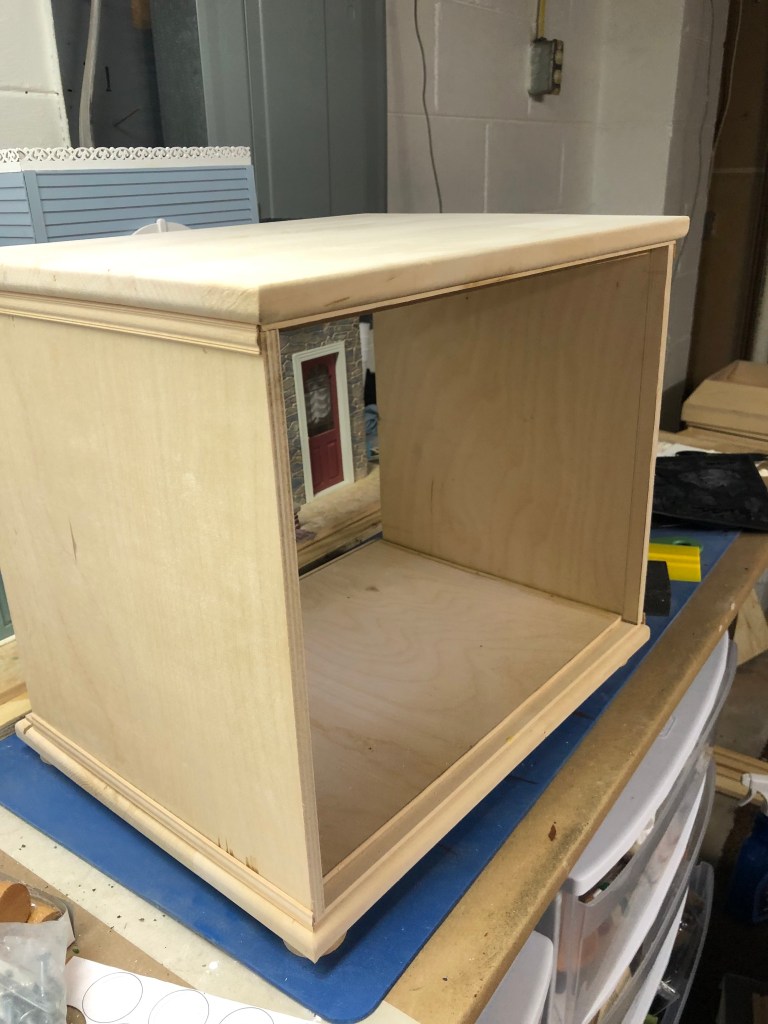 Now, how about a fancy box. The box that the library will be in is a box that I made with simple wood pieces for Michael’s. It consists of two pine rectangular panels 11×14 and 11/16″ thick by ArtMinds and four 12 x12 wood boards, my Powershot that uses brad nails and staples and some wood glue.