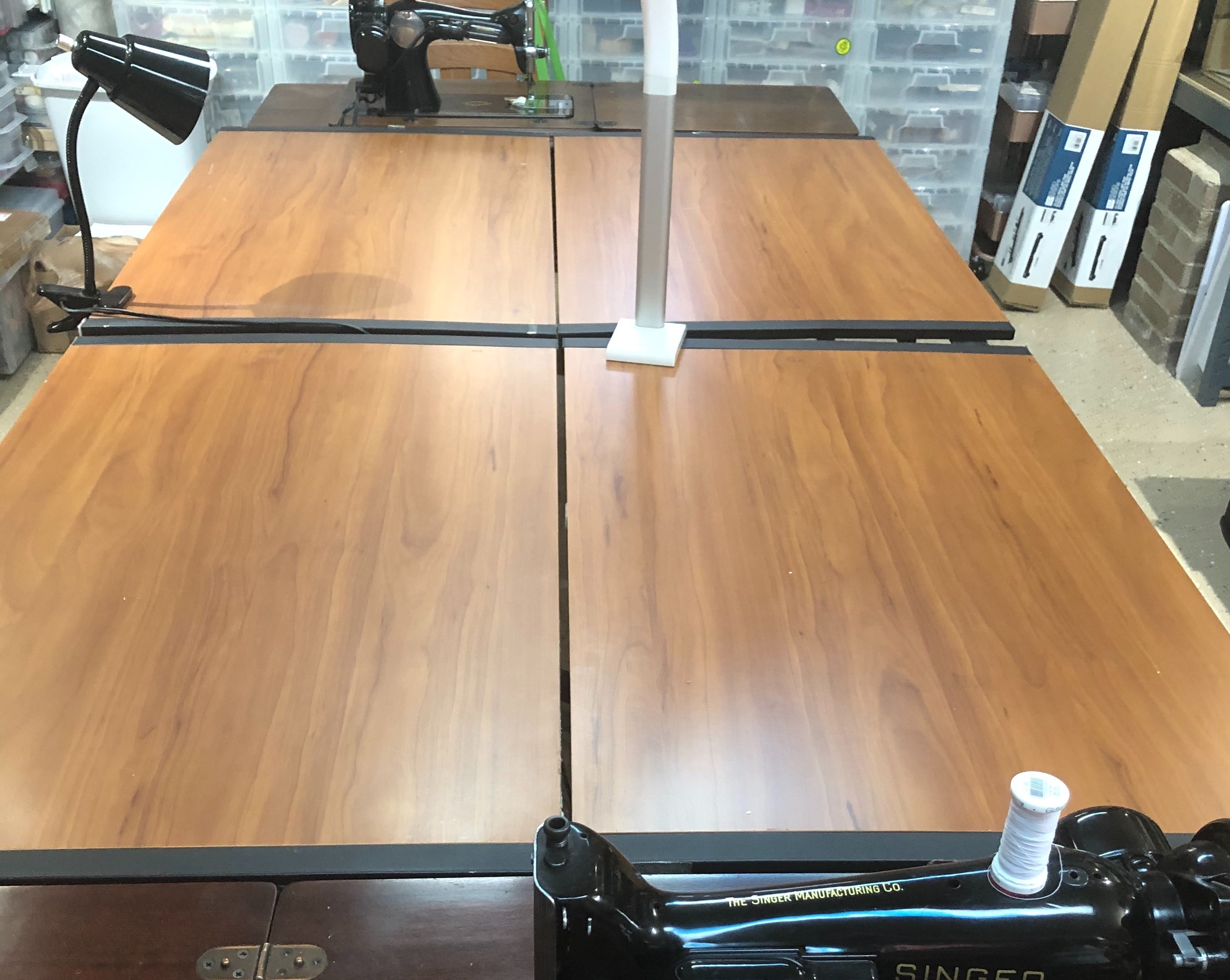 Talking about the tables, lol! My current setup was two sets of L shaped desks that had 3 pieces each. It was two straights and a curved corner piece. I took off the corners and pushed the four straight sections together. The length was good and the width was good but the cracks in between were not. Tables were just added to the list.